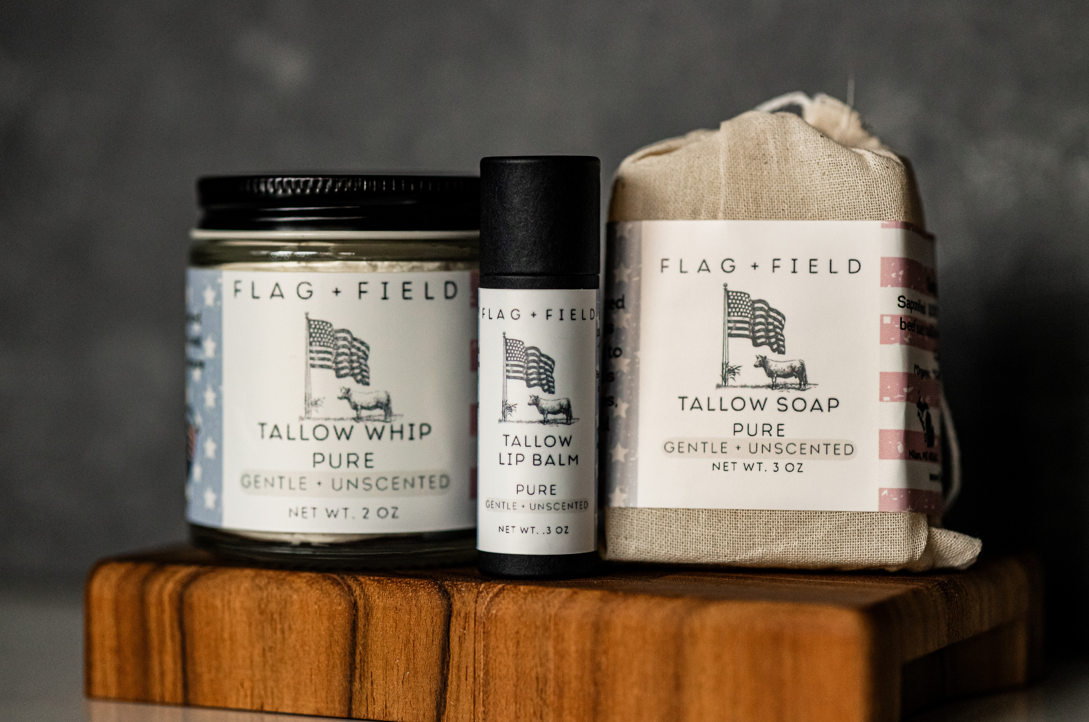 Discover the ultimate skincare experience with our Pure Bundle, thoughtfully curated to provide your skin with deep hydration, soothing nourishment, and natural protection. Packed with the power of nutrient-rich tallow, this bundle includes three luxurious essentials from our Pure line — 3 oz. Pure Tallow Soap, Pure Tallow Lip Balm, and a 2 oz. Pure Whipped Tallow—designed to work harmoniously for radiant, healthy skin from head to toe.